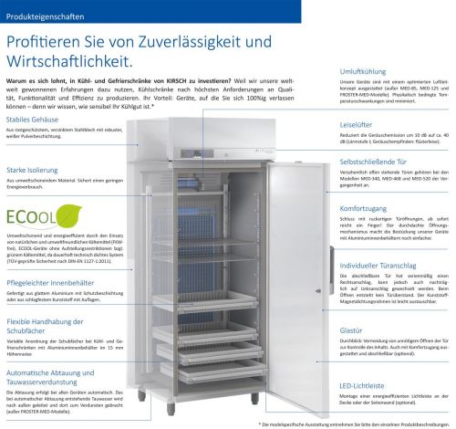 - KIRSCH-Luftleitkonzept: Weltweit geringste Temperaturunterschiede im Innenraum dank optimaler Abstimmung von Luftleitblechen, Lüftern und Kältemaschine. Dies belegen zahlreiche Qualifizierungen der Pharmaindustrie. Sparen Sie sich Gedanken, in welcher Schublade Sie was lagern dürfen, da überall die gleiche optimale Lagertemperatur herrscht und somit für höchste Sicherheit der Medikamenten- und Imfpstoffkühlung gesorgt ist.